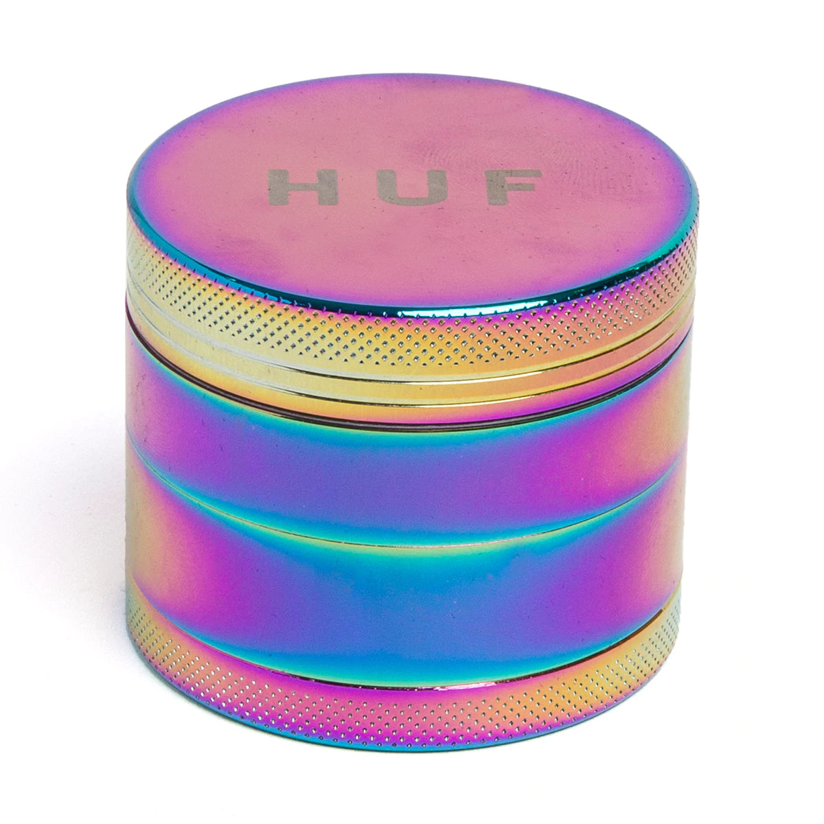 Light up with the HUF Grinder, made of durable metal with a reflective iridescent finish. Featuring a laser-engraved HUF OG logo on the lid and HUF's signature "Fuck It" slogan at the bottom, this pocket-sized piece will grind your greens fine so you can stay lit.