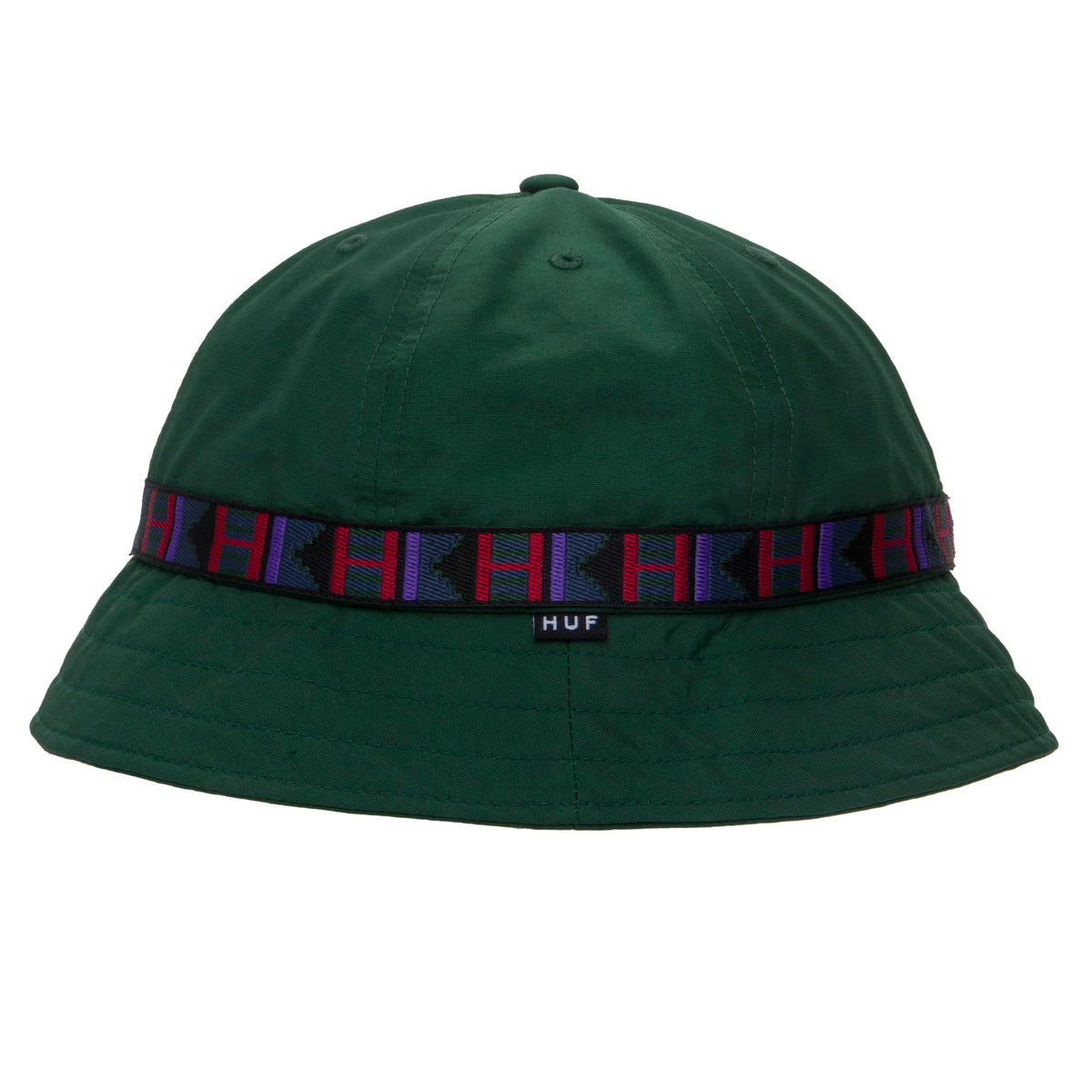 Inspired by vintage outdoor camping gear, the Teton Bell Hat is made of lightweight Taslan nylon in a classic 360-degree brim silhouette. Featuring custom jacquard taping around the crown, the hat is finished with a woven HUF flag label at the visor seam.